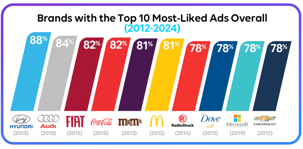 To find out, we analyzed hundreds of Super Bowl ads from 2012 to 2024 using MarketCast Brand Effect, our industry-leading solution for measuring Ad Breakthrough and Resonance. We focused on one core Brand Effect metric: Likeability—a measure of how much audiences truly enjoyed or disliked an ad.