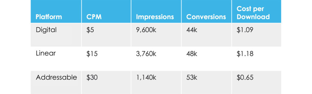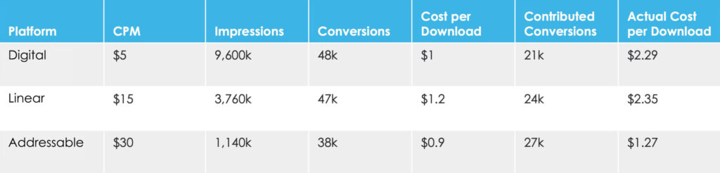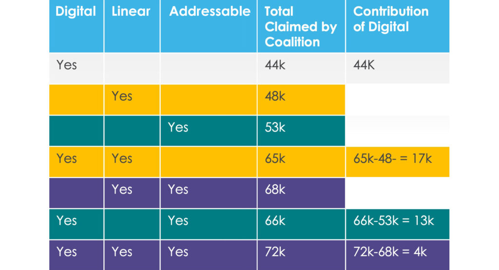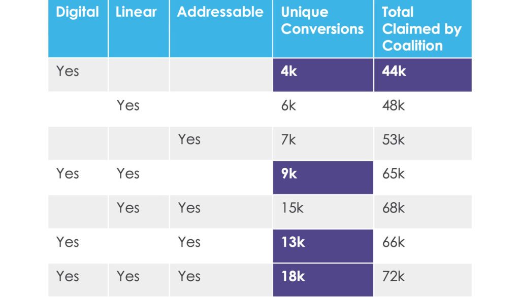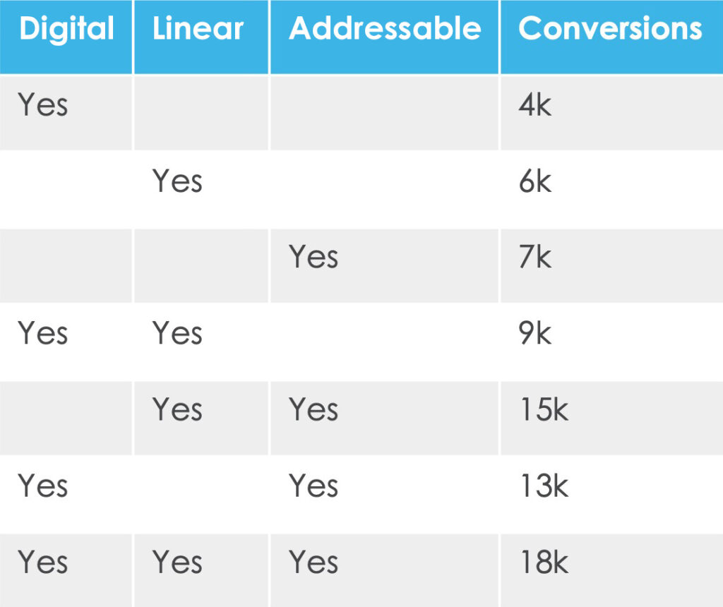 The table on the right shows how many conversions occurred after a device was exposed on each of the different media – Digital, Linear and Addressable.