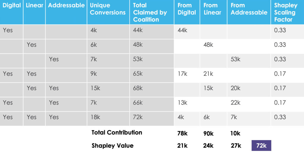 We then compare each coalition’s value against every other coalition’s value to get each player’s incremental contribution in the coalition. In this example, the contribution of Digital to the Digital /Linear coalition is 11k because the total claimed by that coalition, 59k, is 11k more than the sum claimed by the Linear coalition (48k):