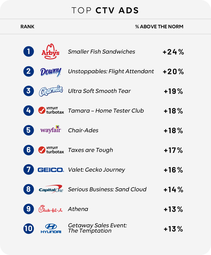 - Products that Pop – Ads that leaned into straightforward narratives and strong product visuals, like Charmin, Arby’s and Chewy, saw above-average performance.