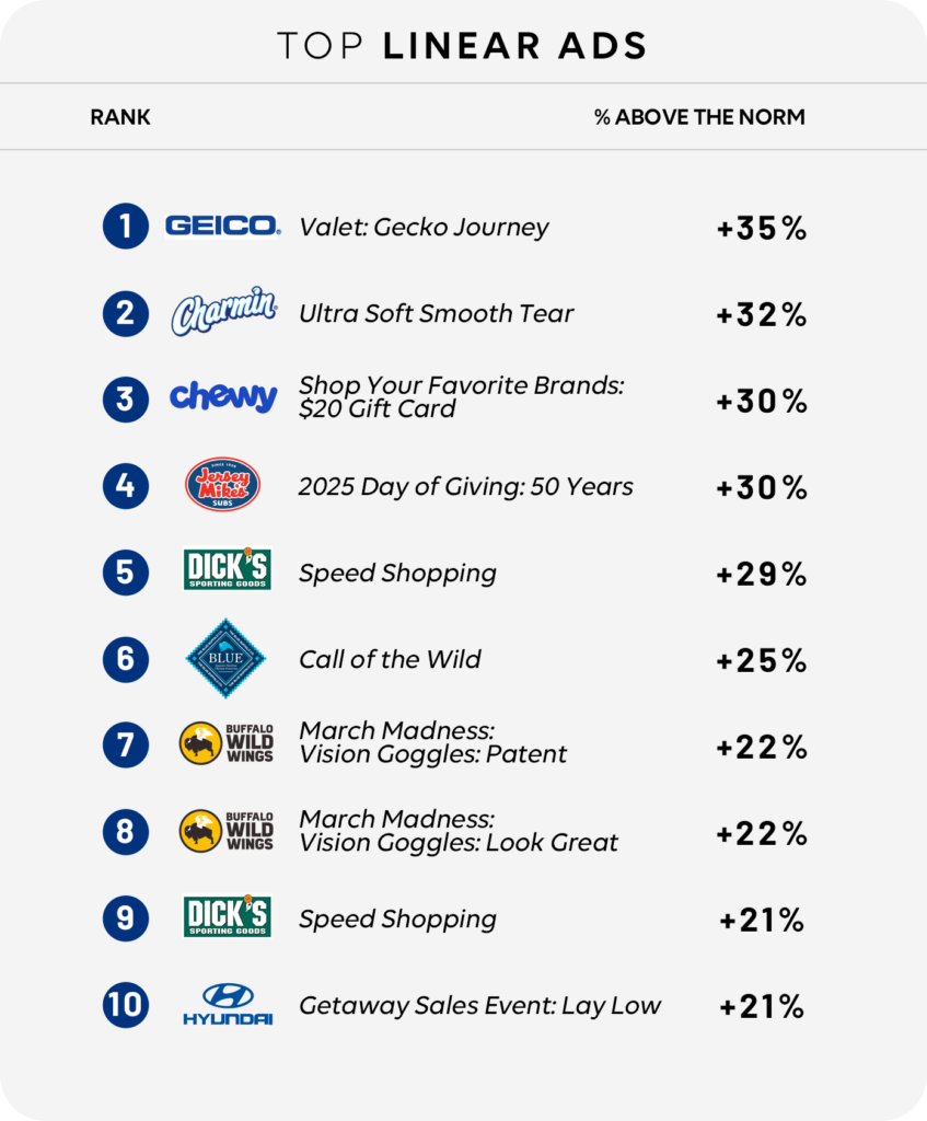 - Madness Measured – Spots that tapped into March Madness energy rose to the top—GEICO, Dick’s Sporting Goods, TurboTax—and brought all-star energy, humor, and standout storytelling that resonated with sports fans.