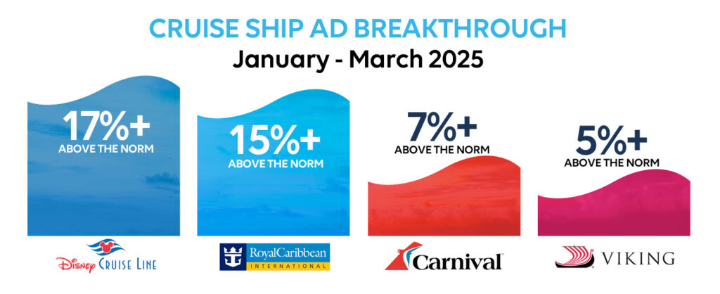 Using MarketCast Brand Effect—our real-time, in-market ad measurement tool—we analyzed how cruise ads fared for Ad Breakthrough, Brand Recall, and Messaging during peak booking season: January to March 2025.
