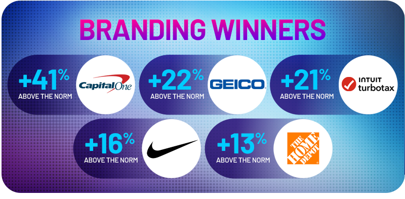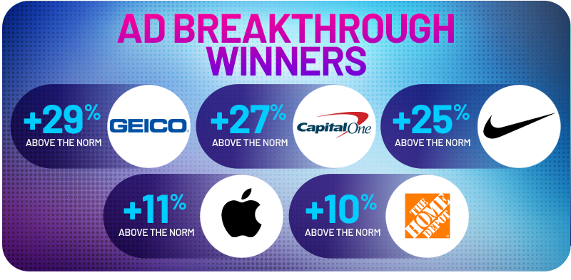 GEICO’s Gecko and Capital One’s star trio (Jackson, Barkley, Lee, and “Cap One Bank Guy”) showed that beloved celebrities and brand personalities still pack a punch. Their charm, familiarity, and sharp comedic timing helped these spots soar past MarketCast’s Ad Breakthrough and Branding norms.