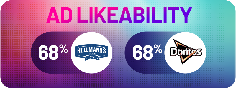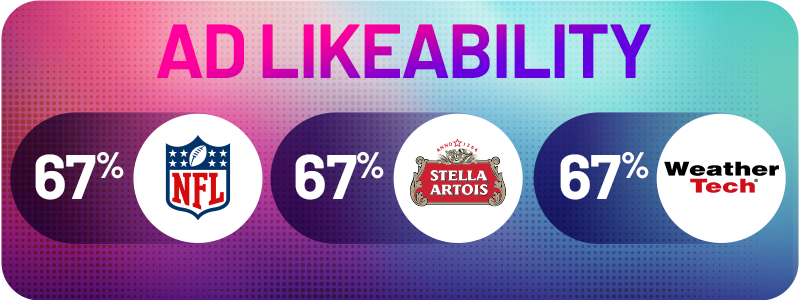 Hellmann’s and Doritos secured their place in MarketCast’s Top 10 for Likeability, tying at 68%. Hot on their heels, the NFL, Stella, and WeatherTech each earned a solid 67% Ad Likeability.