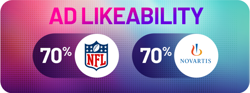 Both the NFL and Novartis tied for second place with 70% Ad Likeability.